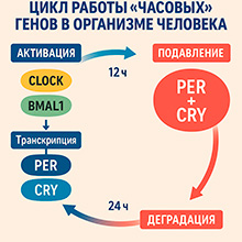 - Гены PER и CRY, будучи продуктами этих реакций, накапливаются в клетках и, достигнув определенного уровня, подавляют активность CLOCK и BMAL1.